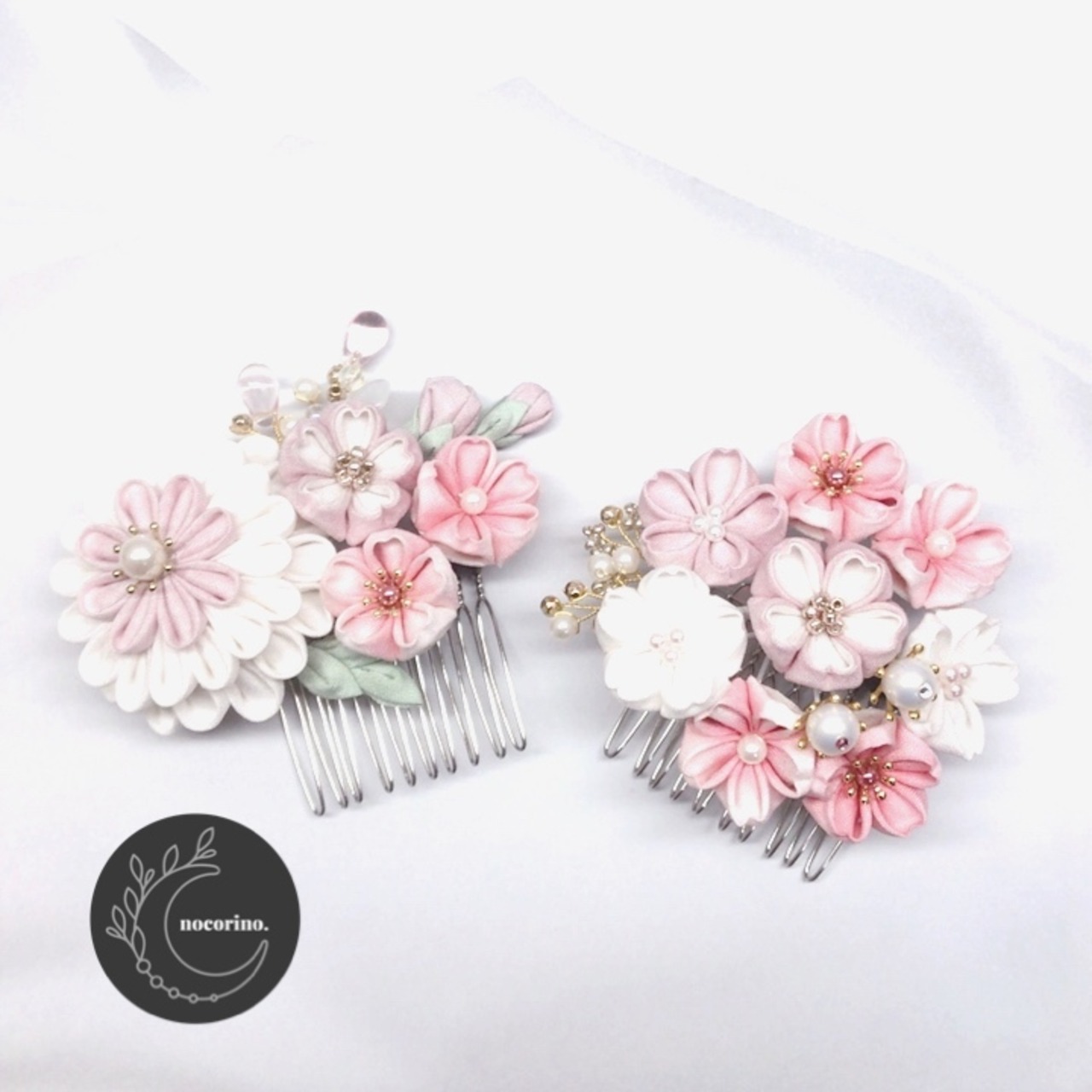 桜をメインに、パールやビーズの小枝をプラスし可愛いらしさがある髪飾りに仕上げました。
