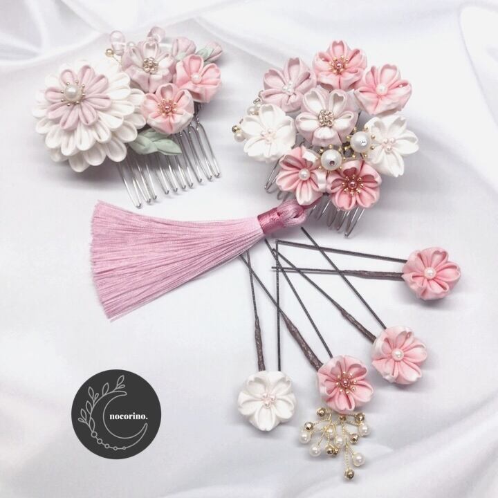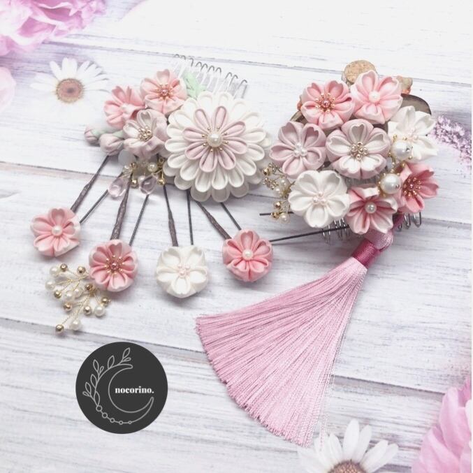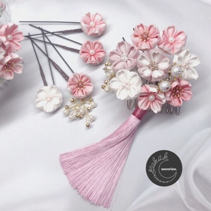 こちらはコームタイプの髪飾2点、Uピンのお花4本、タッセルの計7点セットです。