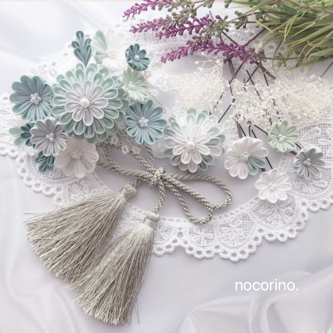 全体的にグリーン系でまとめ、可愛い過ぎず落ち着いた雰囲気の髪飾りです。