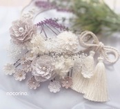 ベージュ系のくすみカラーでまとめ、大人かわいい髪飾りに仕上げました。