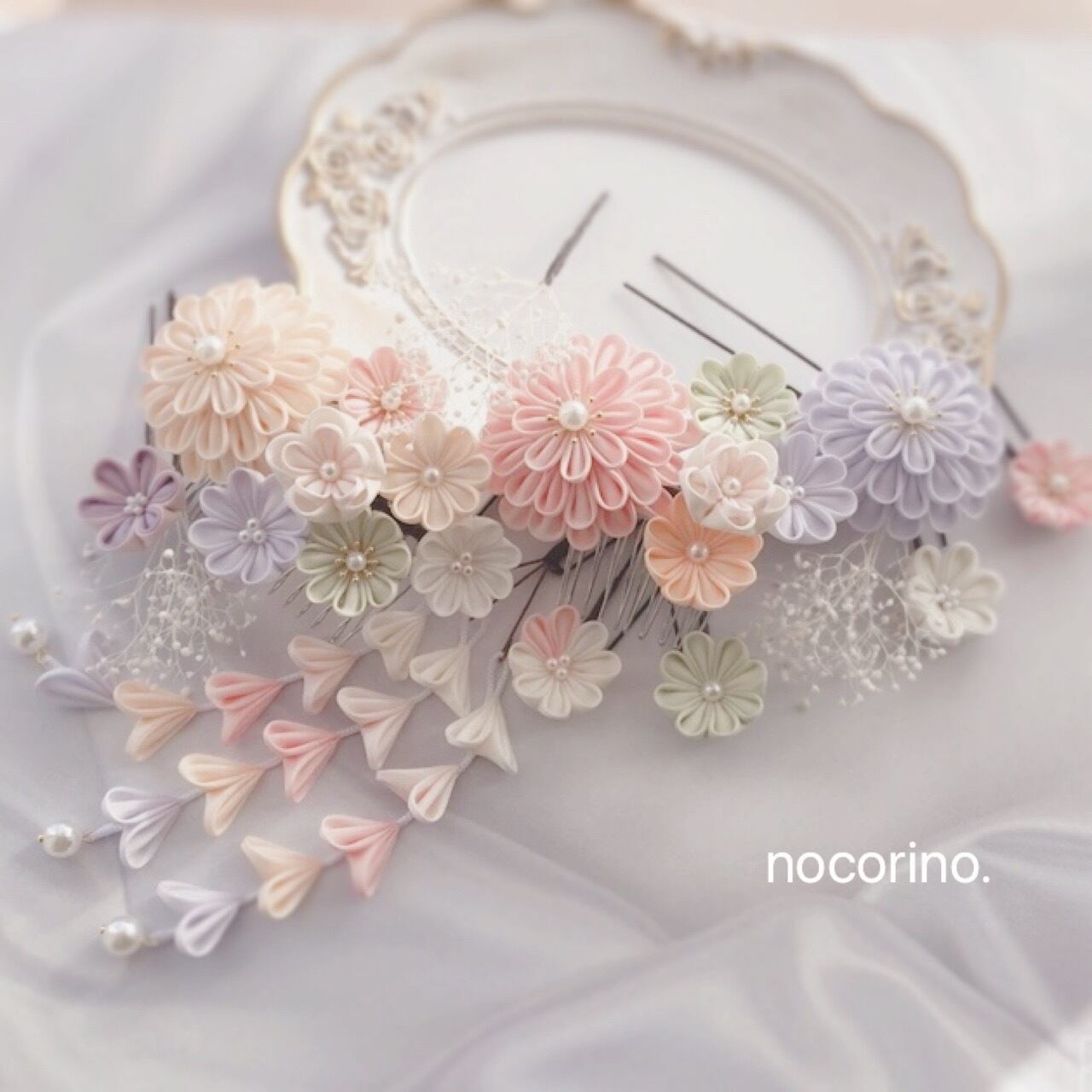 全体的にパステルカラーで優しい雰囲気にまとめた髪飾りです。
