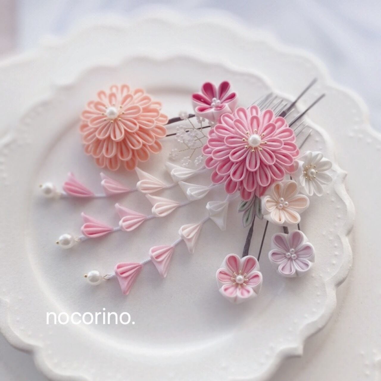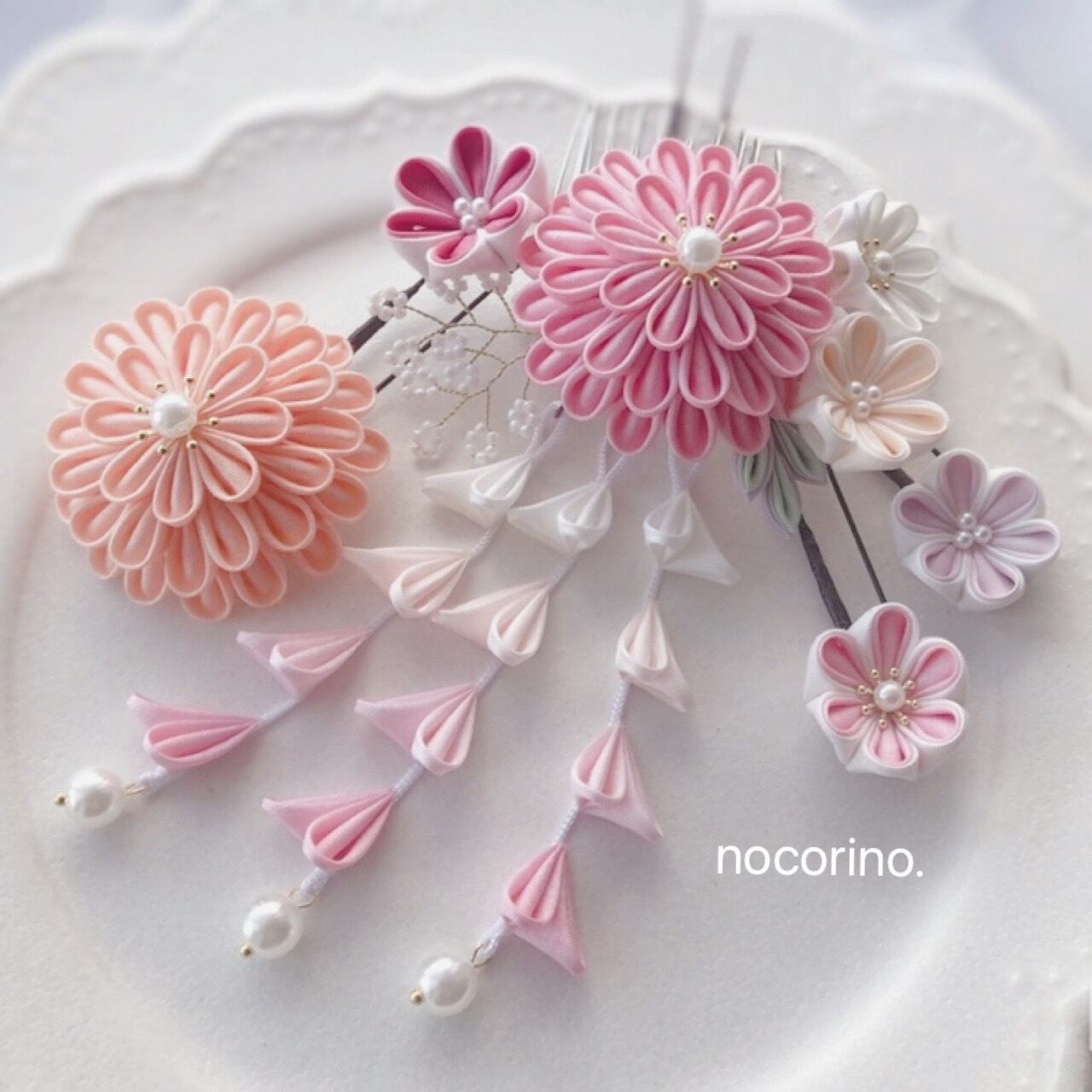 ピンク、オレンジ、紫、白のカラーで優しい色合いでまとめ、お花畑のような可愛いらしい髪飾りです。